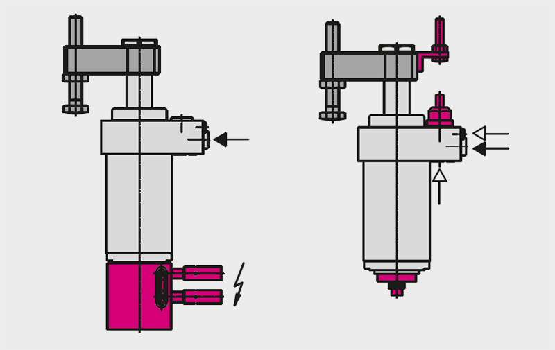 I cilindri a doppio effetto sono più adatti alle applicazioni di lavorazione che prevedono l’uso di refrigerante in quantità rilevanti. Infatti a differenza dei cilindri a doppio effetto, che sfruttano il fluido idraulico pressurizzato su entrambe i lati del pistone, mentre i componenti a semplice effetto hanno una piccola camera d’aria per la molla su un lato del pistone o dello stelo. L’aria viene prevalentemente espulsa durante la corsa di serraggio e viene poi aspirata durante la corsa di sbloccaggio, generando un effetto di depressione e risucchio. L’uso di refrigeranti e fluidi da taglio deve quindi essere considerato nella progettazione dell’attrezzatura. Sebbene tutti i serraggi a semplice effetto siano dotati di filtri dell’aria in metallo sinterizzato per impedire l’ingresso di contaminanti, esiste comunque la possibilità che fluidi aggressivi entrino nell’area della molla (soprattutto con la lubrorefrigerazione a flusso continuo), causando eventualmente malfunzionamenti.