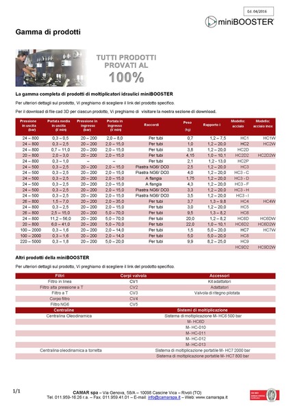 Raccolta di volantini e flyer che illustrano sinteticamente i prodotti della miniBOOSTER. Nelle pagine seguenti può anche essere scaricato il catalogo compatto che illustra i prodotti più diffusi, dando una rapida panoramica della gamma di moltiplicatori. Le tabelle indicano per sommi capi le caratteristiche principali della vasta gamma di prodotti.
