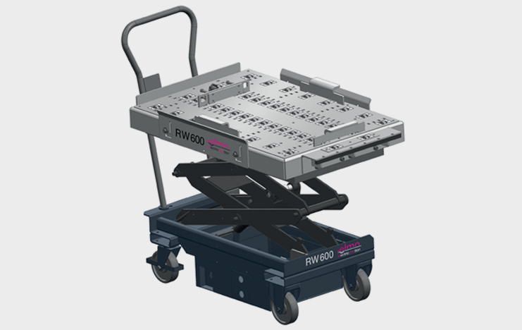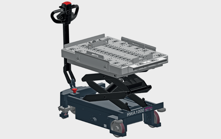Entrambe i modelli dispongono di azionamento elettrico del sollevamento. Il carrello RWA 1000 elmo è studiato per movimentare il carrello e sollevare il sistema a pantografo in modo completamente elettrico.